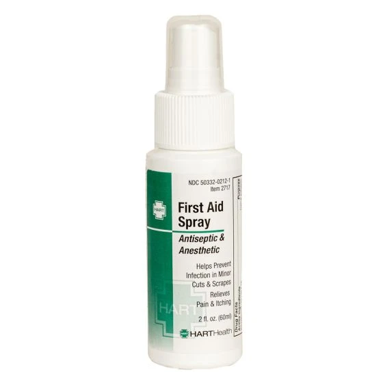 2 fl. oz. spray bottle. Antiseptic & Anesthetic. Benzalkonium chloride 0.1%, Benzocaine 5.0%. To help protect against skin infection and for the temporary relief of pain and itching associated with; Minor cuts & burns, insect bites, and skin irritation.