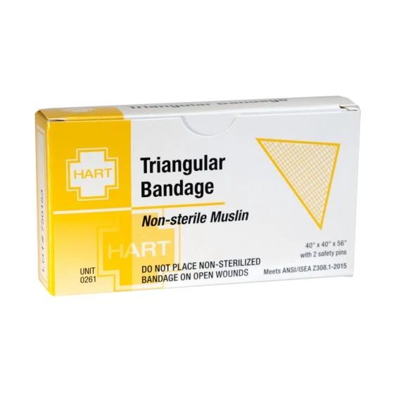 1 bandage per box. 40″ x 40″ x 56″ with two safety pins. Versatile first aid tool with uses such as; A sling to support injured arms, wrists, or shoulders. Acts as a covering for head injuries, secures dressings on large wounds, and creates a cravat to stabilize splints or provide compression during swelling.