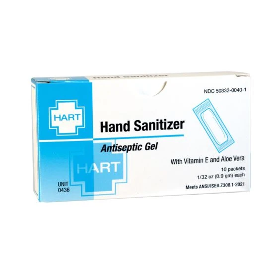 10 packets per unit. 0.9 gm. Antiseptic Gel, with vitamin E and Aloe Vera. For handwashing to decrease bacteria on the skin, Recommended for repeated use. Meets ANSI/ISEA Z308.1-2021.