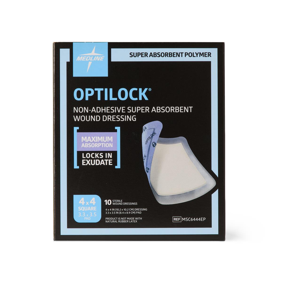 10 per box. 4″ x 4″. Non-adhesive super absorbent wound dressing. Absorbs and locks in drainage, partial and full-thickness wounds. Locks in drainage under compression, protects skin from maceration. Absorbent polymer.