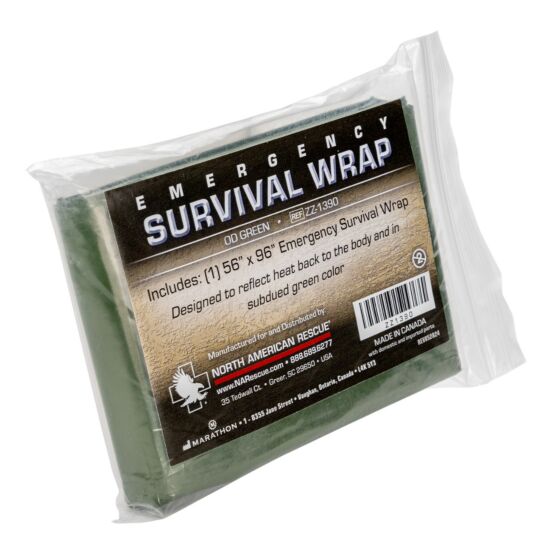 1 60″ x 96″ Emergency Survival Wrap; Designed to reflect heat back to the body and in subdued green color.